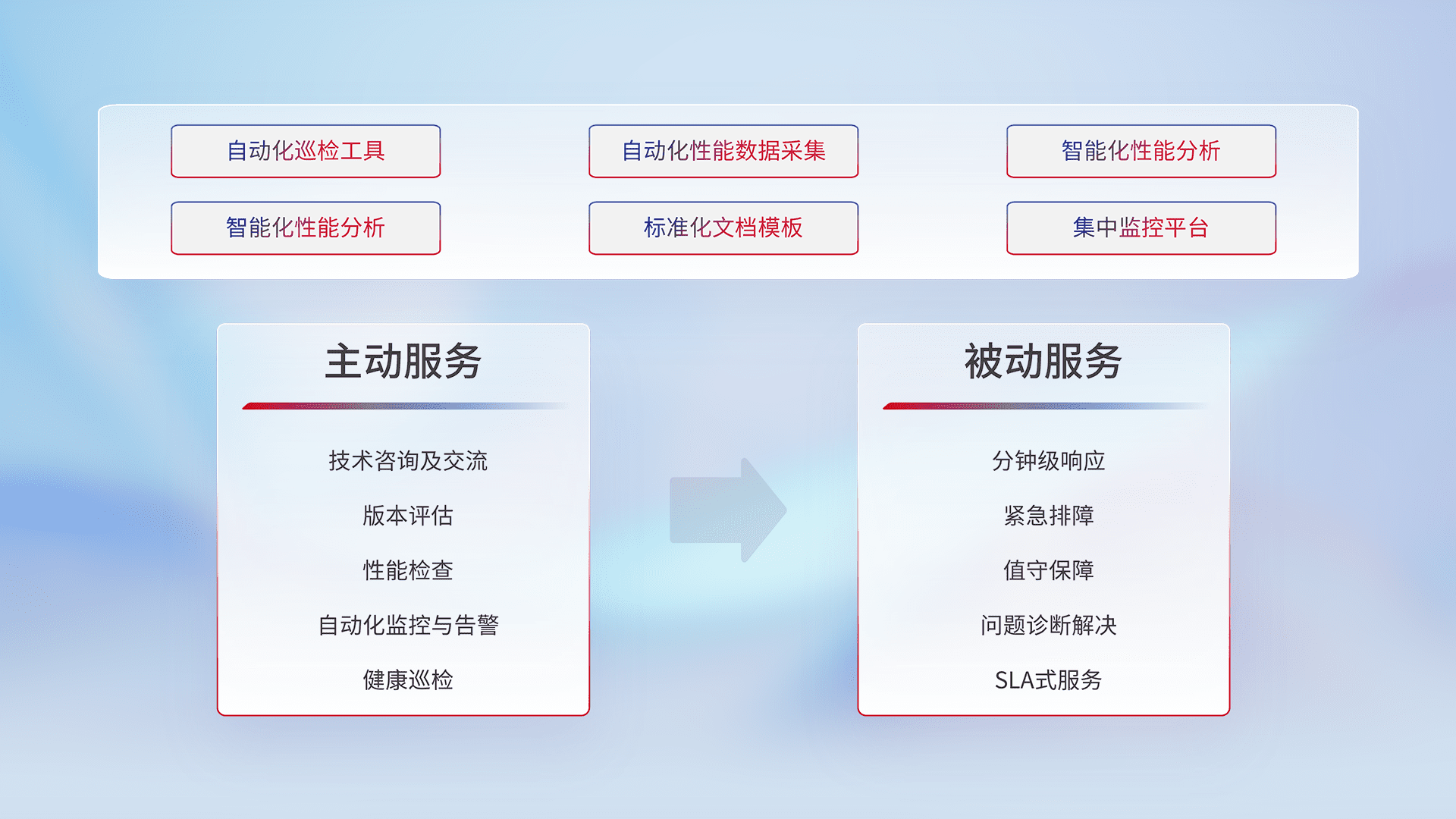 智能化工具和标准化文档,,保障服务质量,,,提供主动服务(包含技术咨询、、、版本评估、、性能检查、、、自动化监控与告警、、、、健康巡检)和被动服务包含(分钟级响应、、、紧急排障、、、、值守保障、、、、问题诊断解决、、SLA服务)。。。。
